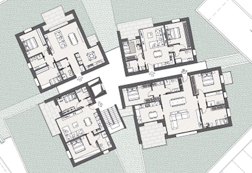 L’idea di “spaccare” l’edificio in quattro differenti corpi, rende permeabile il progetto, migliora l’integrazione con il contesto, apre visuali ricercate verso il parco e permette inoltre di distribuire gli spazi in modo da garantire ai futuri abitanti molta riservatezza, grazie all’indipendenza di ogni unità residenziale.