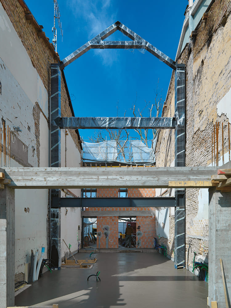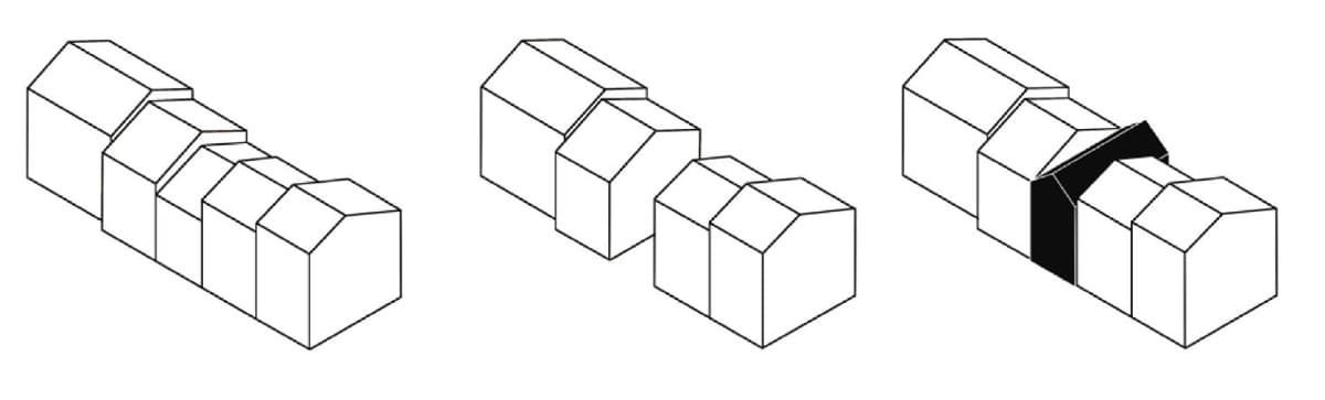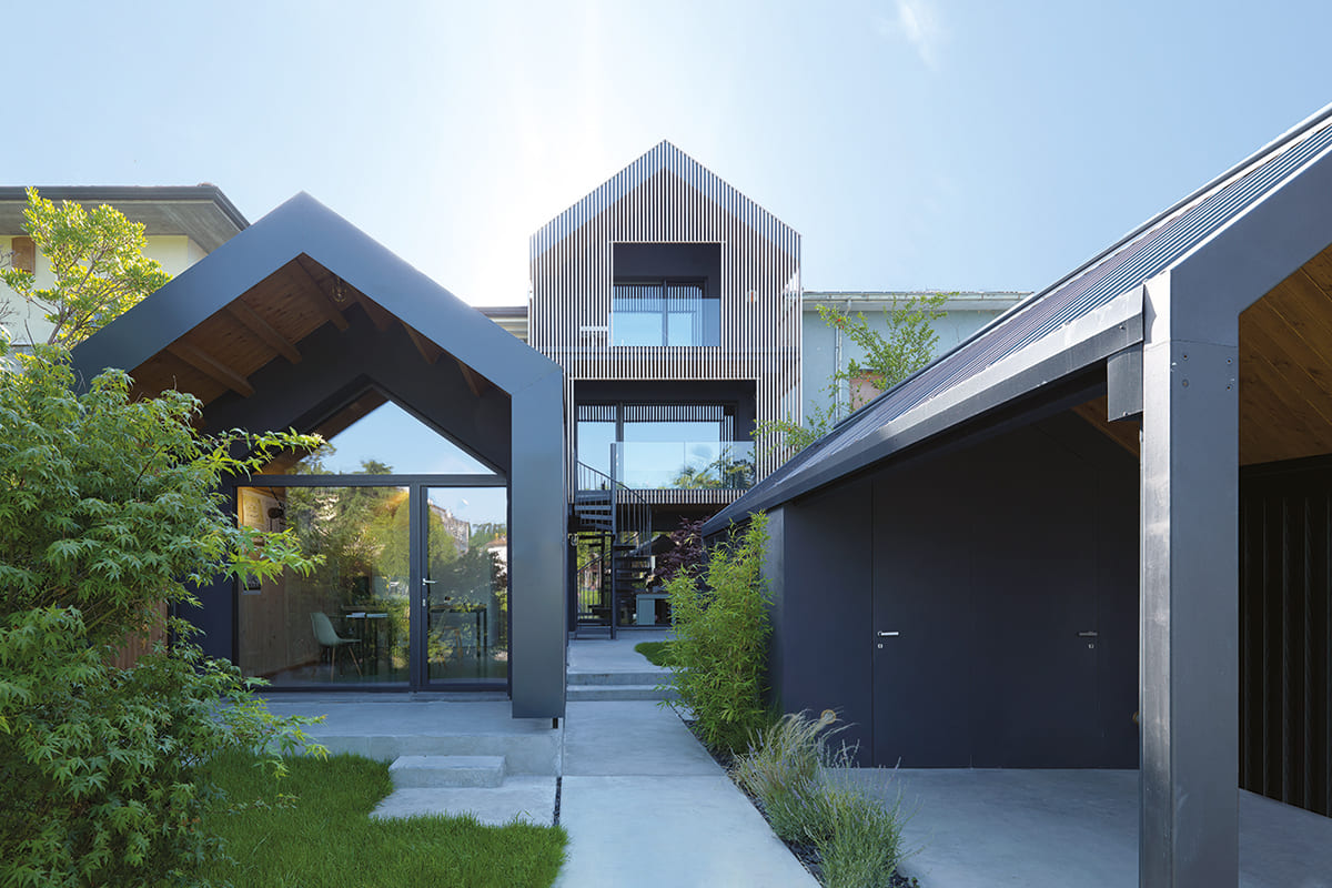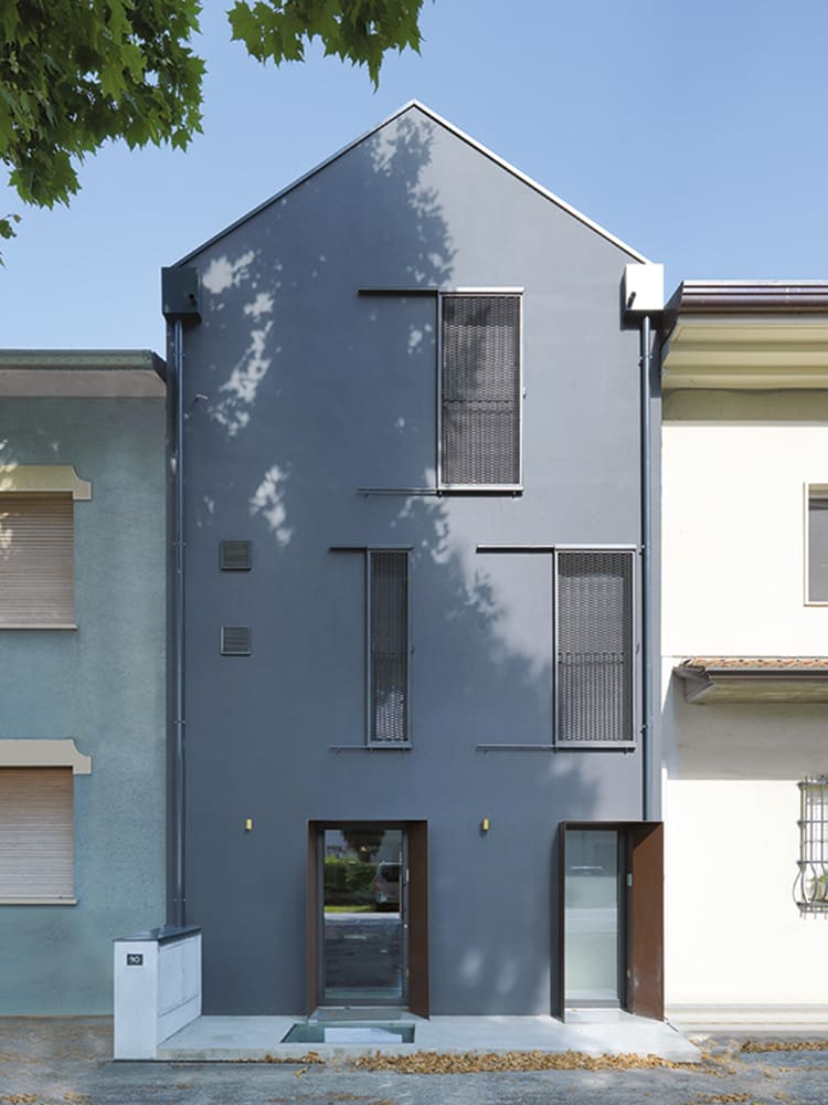 L’intervento ha riguardato la demolizione di una casa a schiera, mantenendo muri laterali e interrato, e la ricostruzione di un edificio su tre piani con due dependance. Il progetto ha integrato diverse tecnologie: un telaio in acciaio centrale; muratura armata POROTON® con cappotto per il fronte ovest, per isolamento e sicurezza sismica; fronte est, con ampie vetrate, in cemento armato per stabilità e continuità strutturale; solai in legno lamellare per ridurre i carichi e semplificare i collegamenti strutturali. L’involucro è talmente efficiente che l’ambiente abitativo si riscalda grazie ai soli apporti solari e interni gratuiti: l’edificio non necessita quindi dell’allacciamento al gas ed è dotato solo di pannelli solari e impianto VMC.