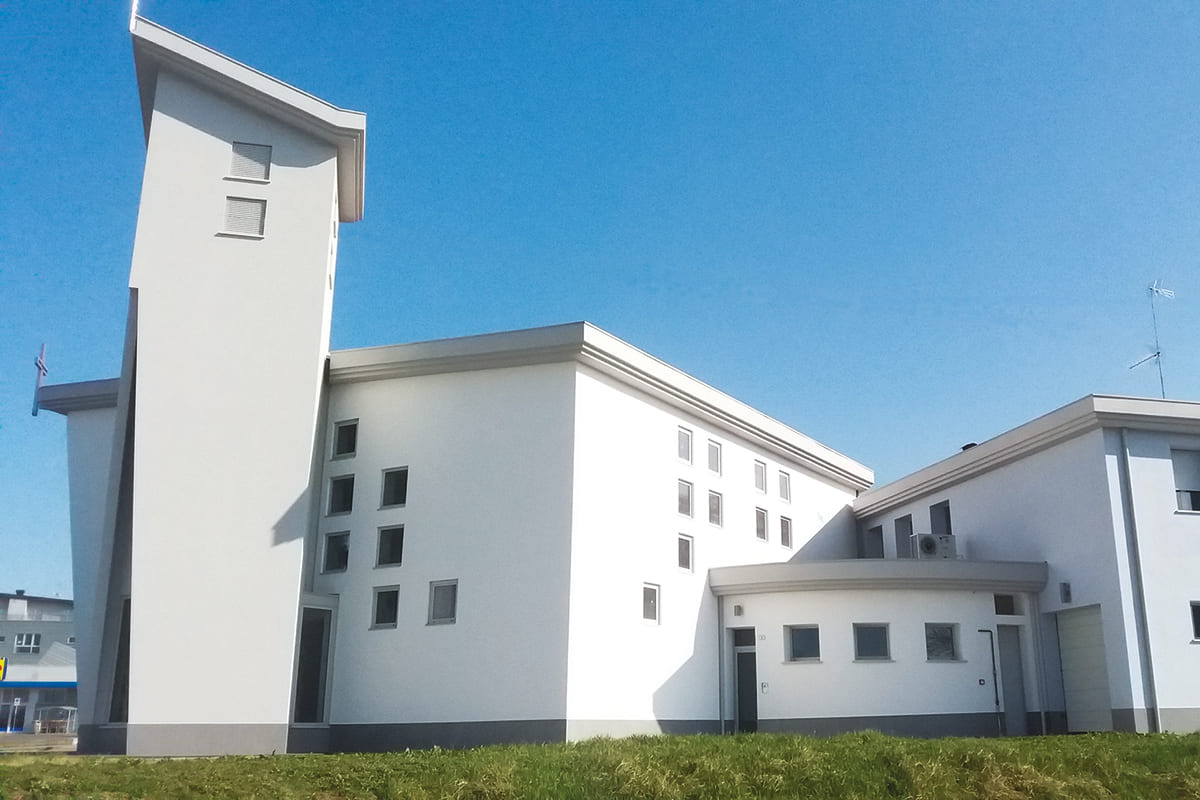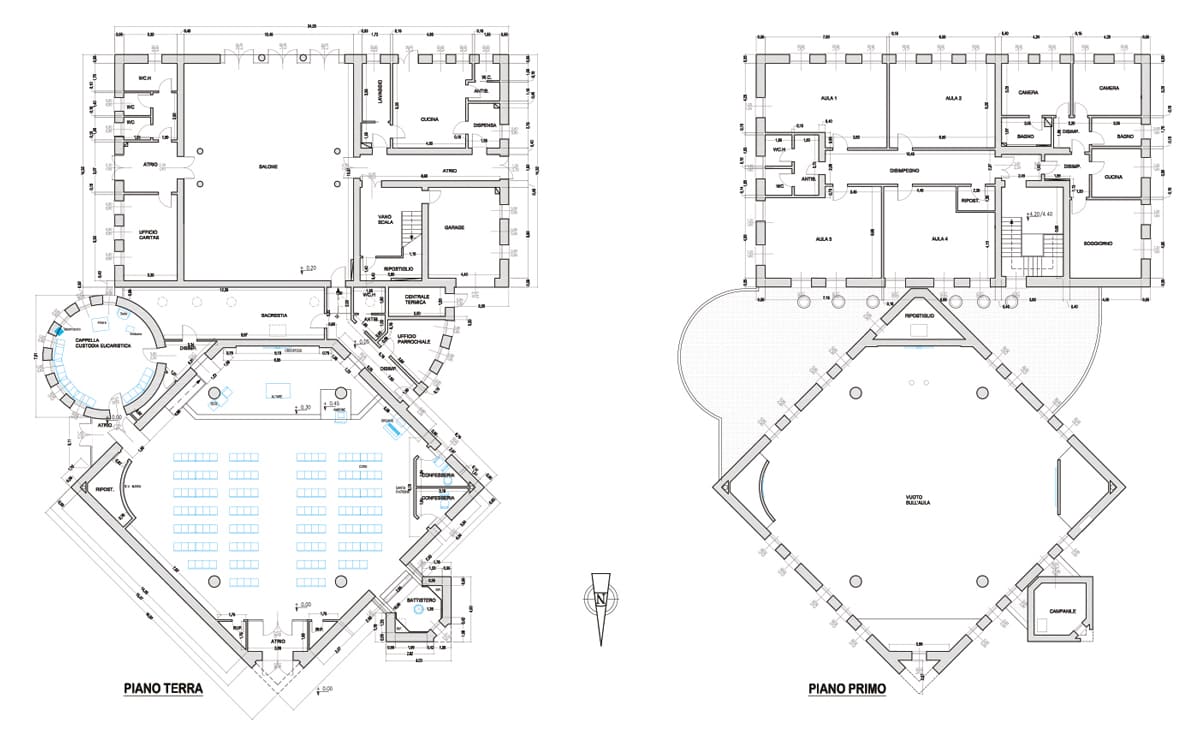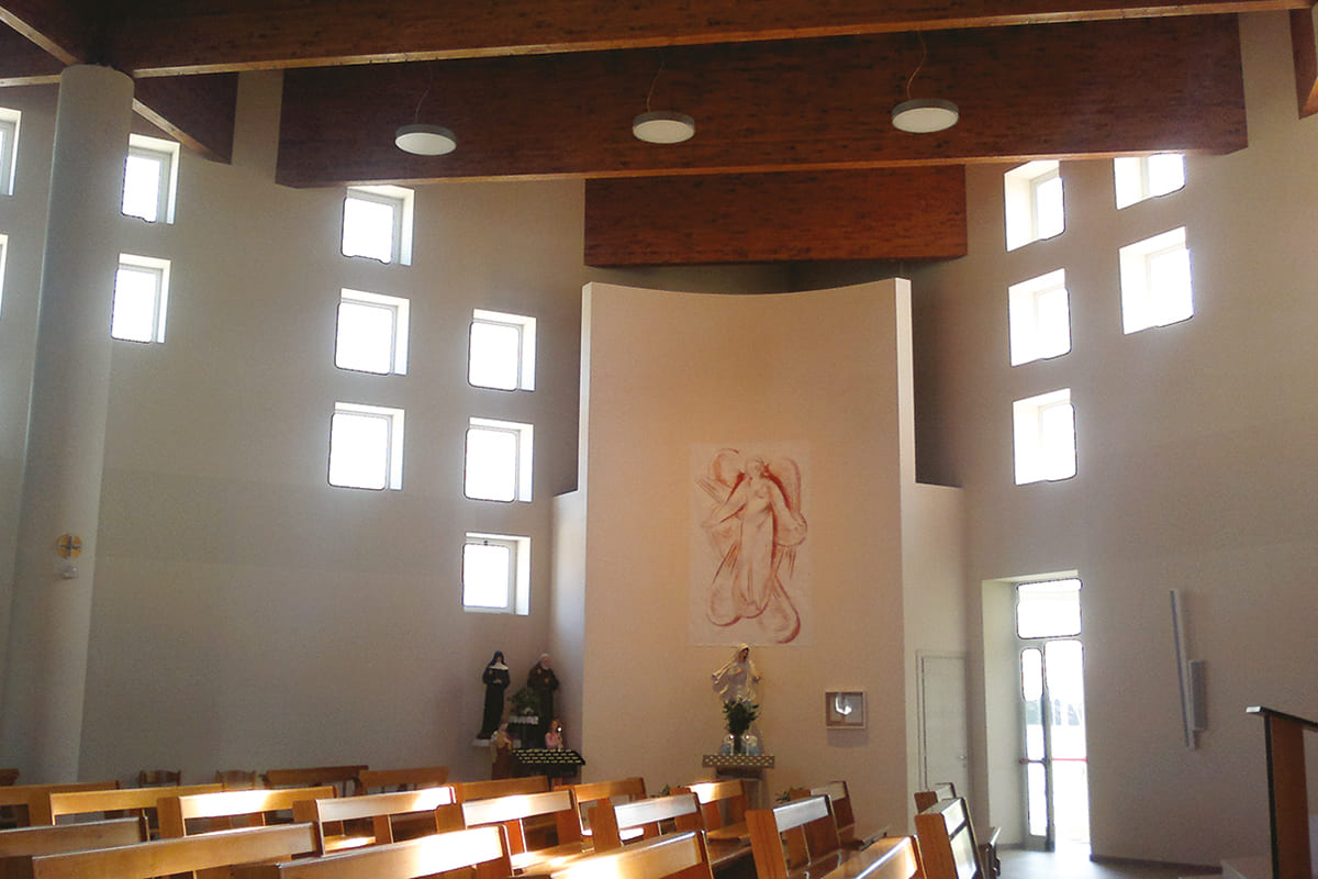 Il progetto valorizza l’uso della muratura armata in zona sismica con soluzioni architettoniche audaci, come pareti curve e murature alti, che conferiscono all’edificio verticalità, matericità, linee essenziali ed incastro di volumi. Inserito in un piano di riqualificazione urbana, trasforma un’ex area industriale in punto di raccordo tra aree residenziali esistenti e quelle di nuova espansione. La composizione planimetrica dei volumi principali (chiesa, opere parrocchiali, canonica e campanile) si basa su forme geometriche simboliche.