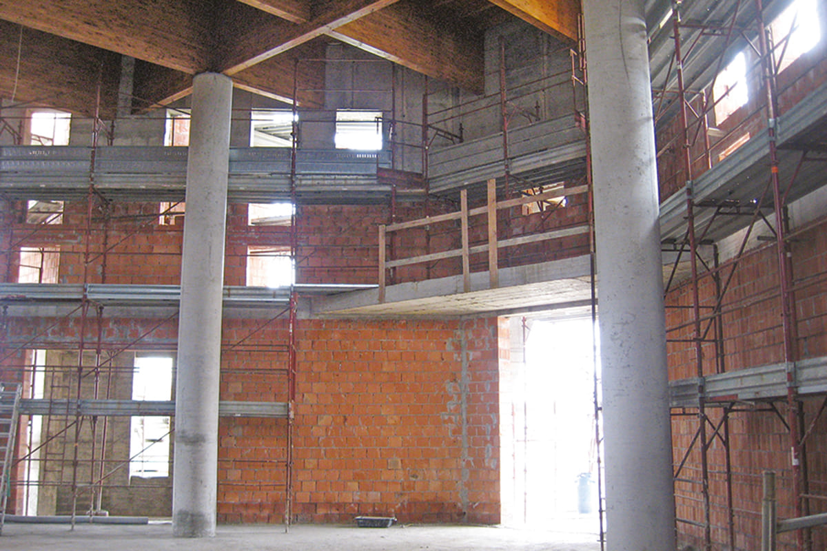 L’intervento ha previsto la realizzazione di fondazioni in jet-grouting, pareti in muratura armata di spessore 38 cm con il sistema rmH, caratterizzato da una distribuzione uniforme di barre singole di armatura, il tutto analizzato con modello numerico a telaio equivalente con macroelementi. Il campanile, parzialmente in c.a., è stato progettato con un modello separato. Sono stati usati materiali ordinari (solai in laterocemento, travi REP, cordoli in c.a.), mentre la copertura della chiesa è in legno lamellare. Gli interni sono rivestiti con contropareti termo-acustiche, che integrano gli impianti. Arredi liturgici, dello scultore Filip Moroder Doss, e finiture in gres porcellanato, celebrano la tradizione ceramica locale.