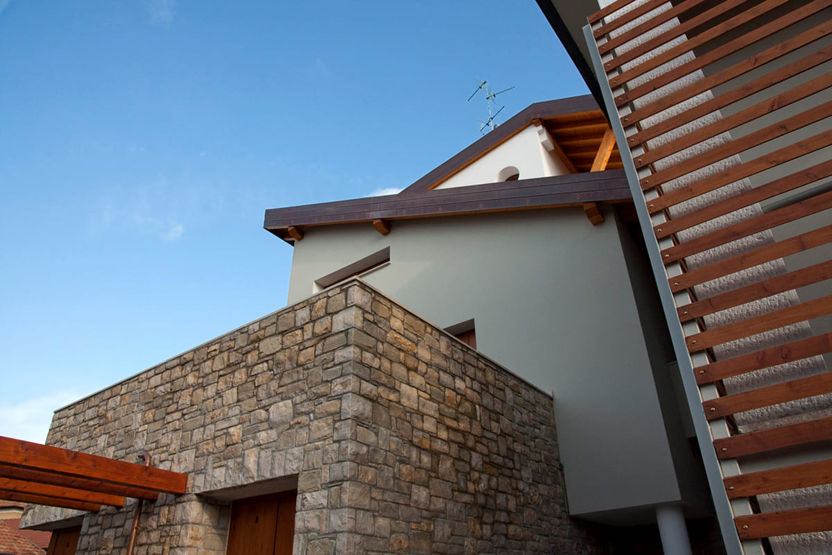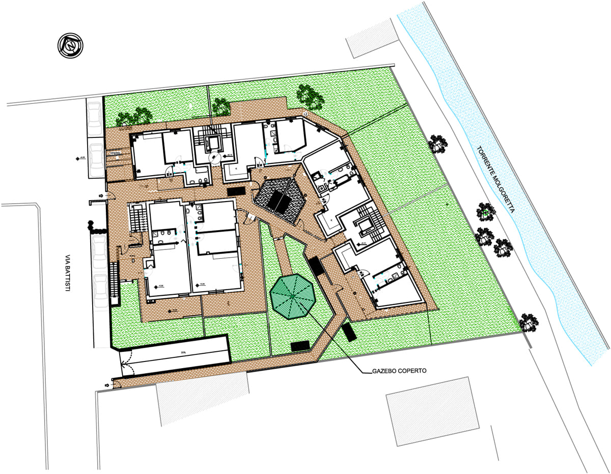 L’articolazione dei corpi edilizi su due o tre livelli, la contrapposizione alternata delle falde di copertura e l’uso di finiture omogenee rafforzano l’integrazione visiva e architettonica. Particolare attenzione è stata riservata all’orientamento e alla forma degli edifici per ottimizzarne l’efficienza energetica, garantendo comfort climatico e risparmio di risorse, anche grazie ad un corretto rapporto con sole, vento, acqua e verde. La scelta compositiva è stata guidata dai vincoli del lotto, dalla presenza di un torrente e dalla volontà di valorizzare lo “skyline” locale.