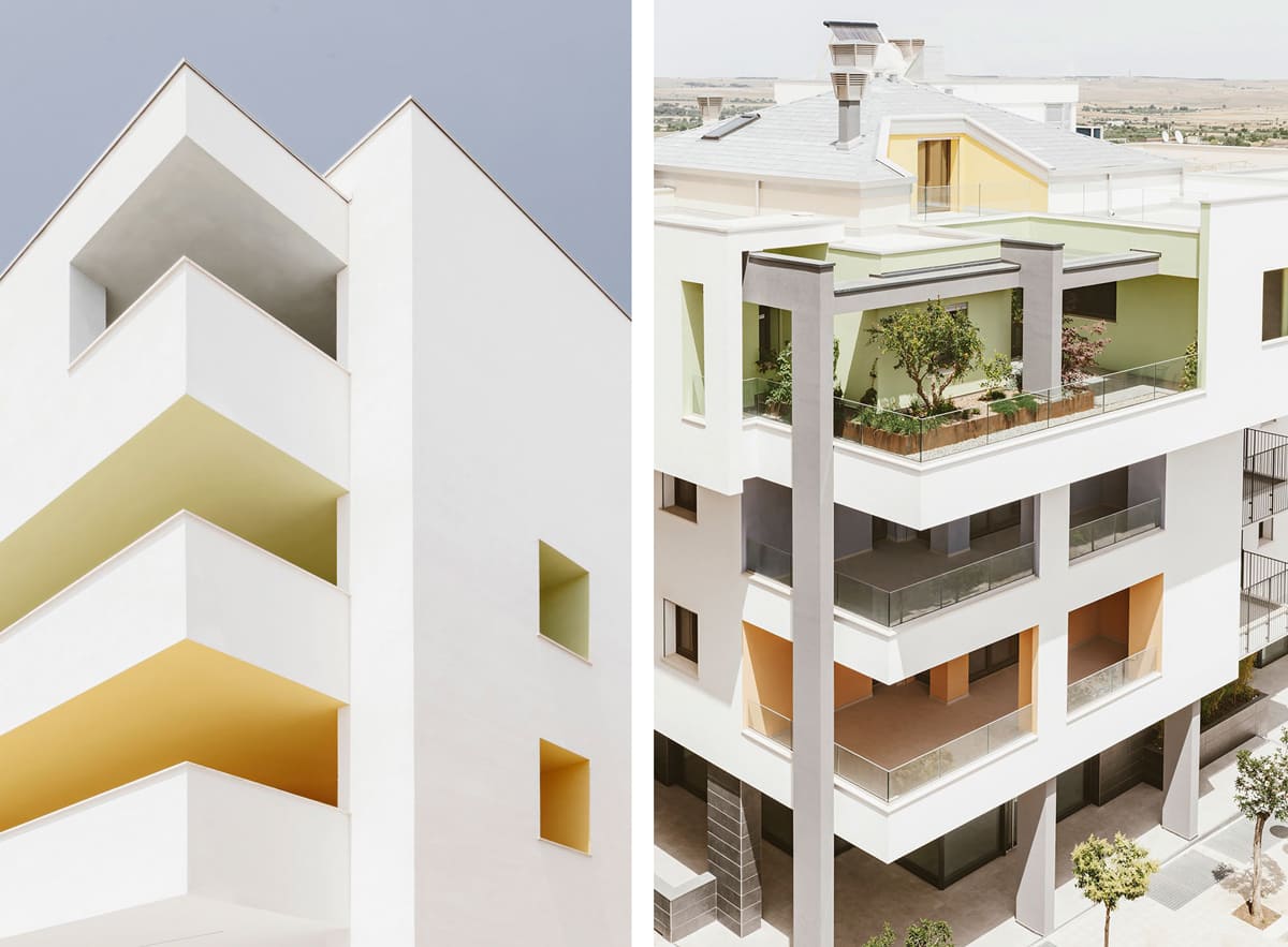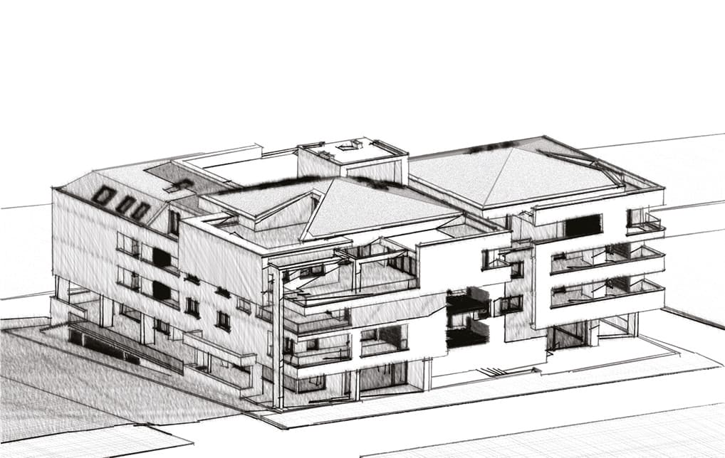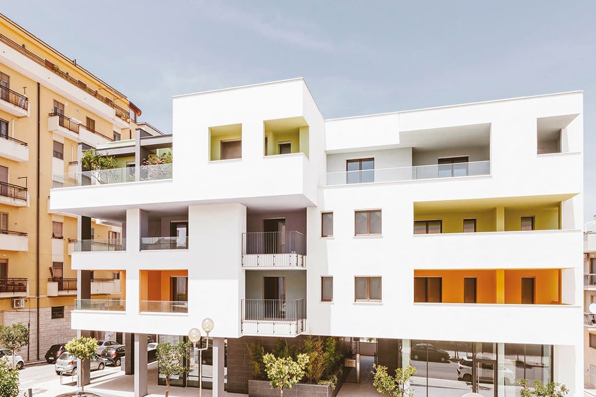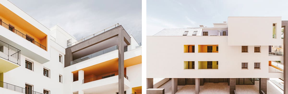 Intervento di demolizione e ricostruzione con ampliamento, esempio avanzato di edilizia sostenibile che integra spazi residenziali e commerciali con elevati standard architettonici ed energetici. L’edificio, certificato CasaClima Gold, con u.i. in classe A4, combina strategie passive (orientamento, aggetti solari, tamponature in blocchi POROTON® ad alta inerzia termica, colori scelti in base all’irraggiamento) con sistemi attivi (materiali isolanti differenziati per l’involucro, infissi a triplo vetro, impianto per climatizzazione e ACS con pompe di calore abbinate a serbatoi di accumulo termico, con integrazione di un impianto solare termico e pannelli fotovoltaici, pavimenti radianti e VMC autonoma per ogni alloggio. Architettonicamente l’edificio rompe con la tradizione, con volumi sollevati dal suolo, facciate dinamiche e assenza di decori.