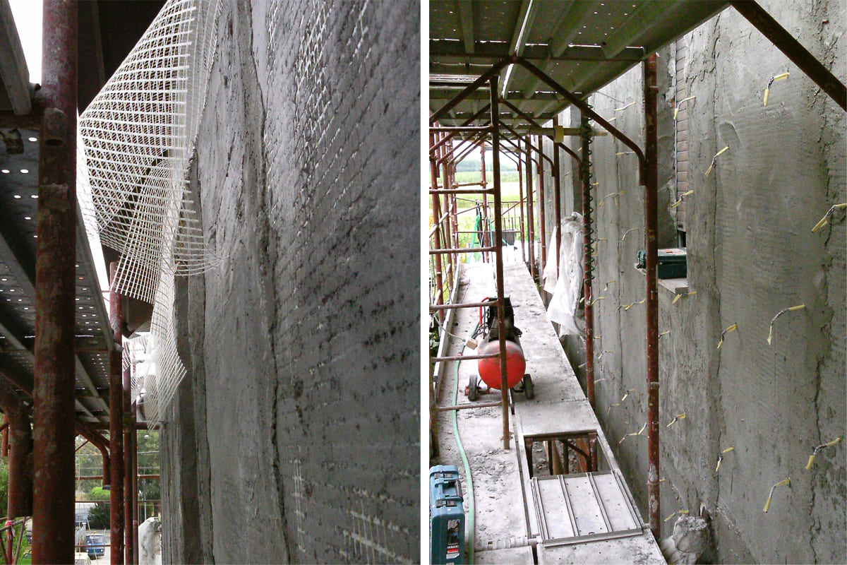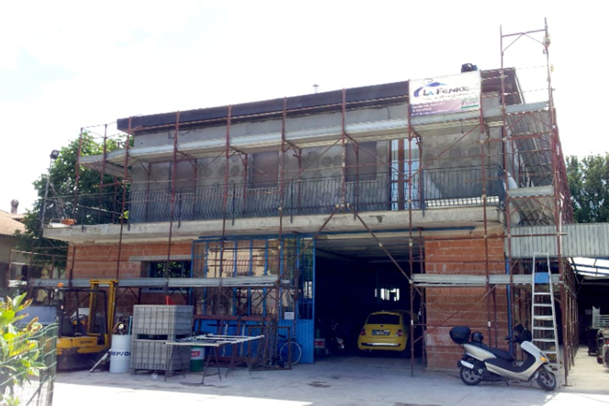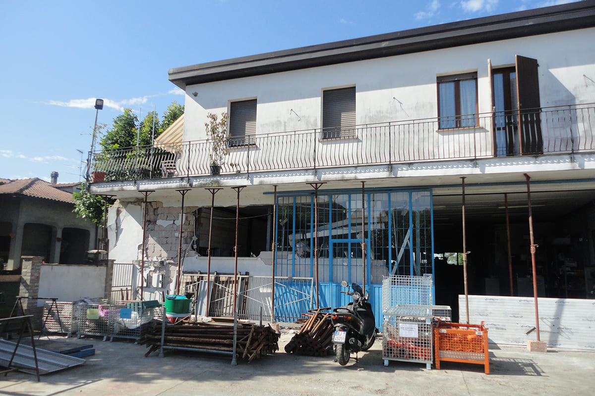 Il fabbricato, gravemente danneggiato durante i terremoti del 2012, è stato oggetto di un intervento di miglioramento sismico che ha previsto la sostituzione delle pareti dell’officina al piano terra con muratura armata POROTON® e il rinforzo al piano primo, residenziale, con intonaco armato in fibra di vetro e un collare in fibra di carbonio.