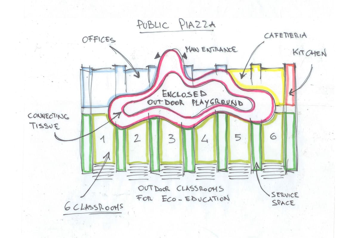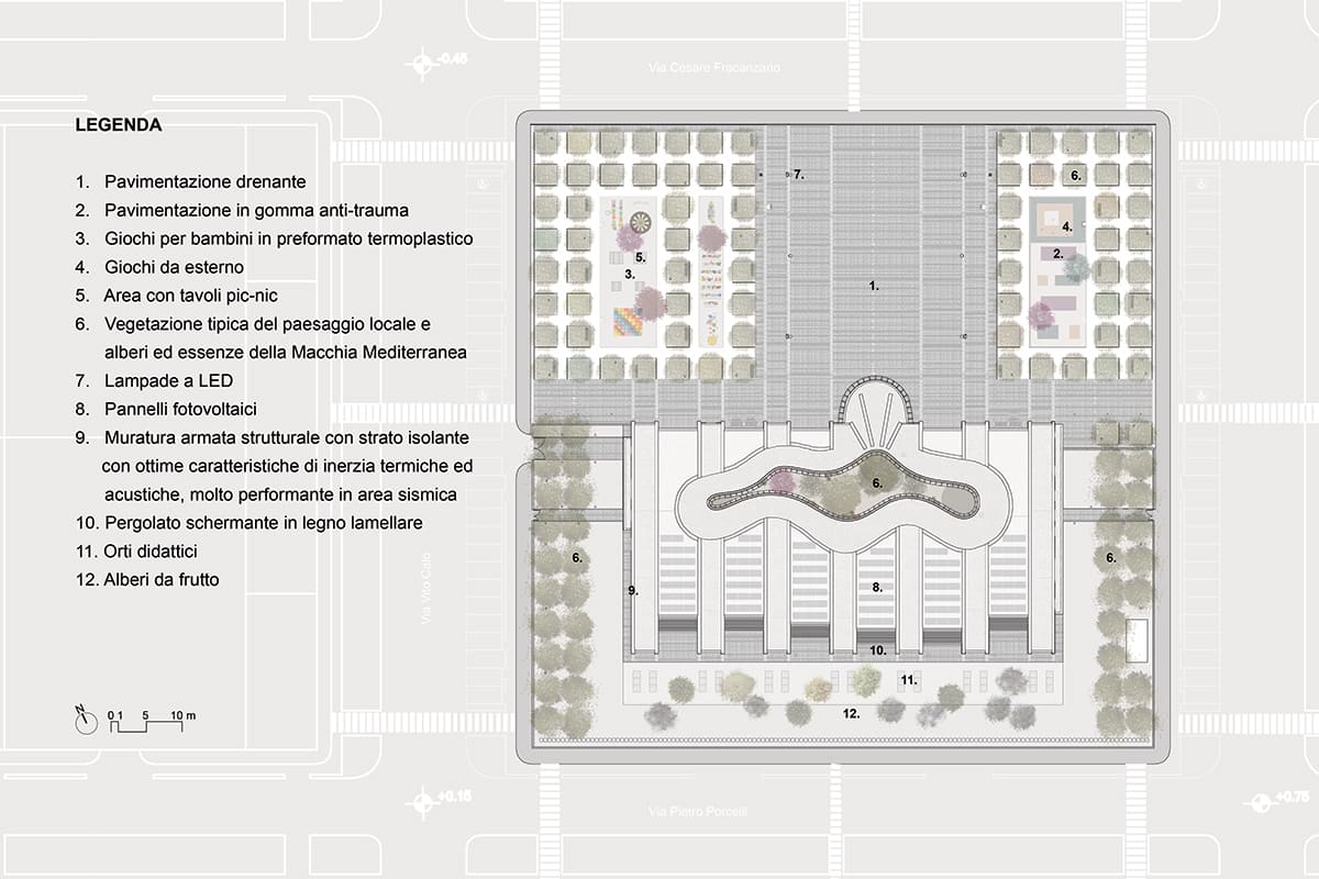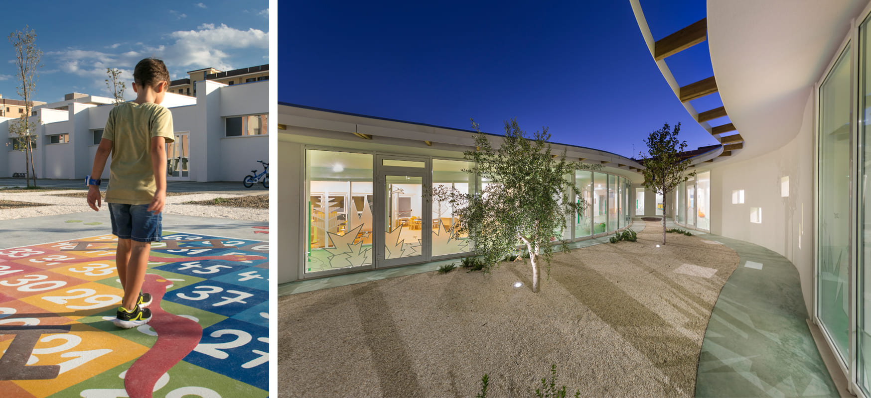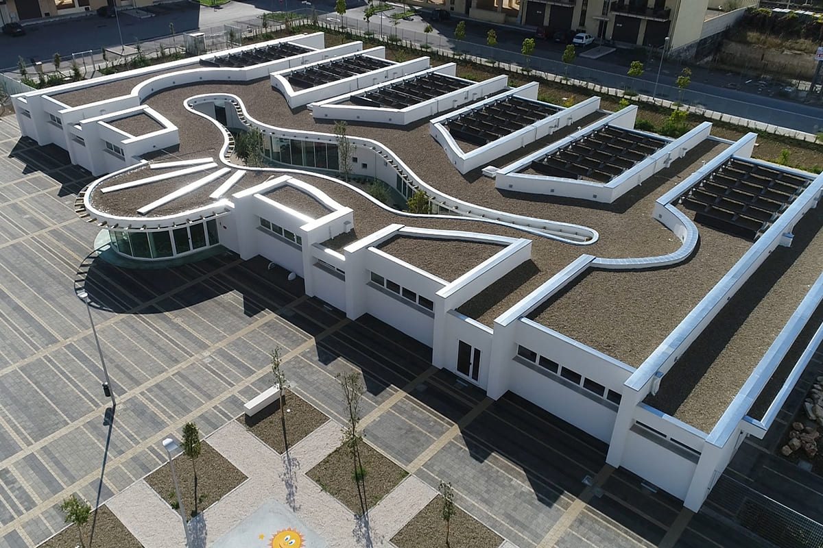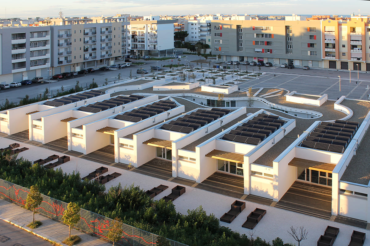 L’edificio, nato dal concorso per la realizzazione di una scuola materna e di una piazza pedonale indetto dal Comune di Bisceglie, è frutto di un lavoro interdisciplinare.