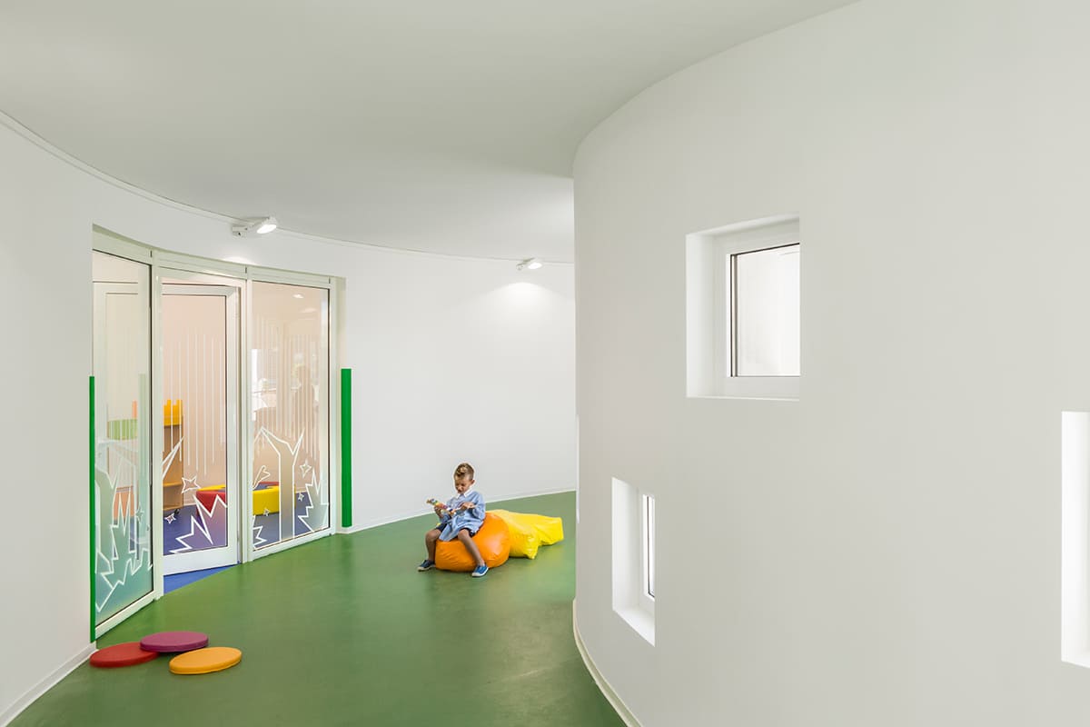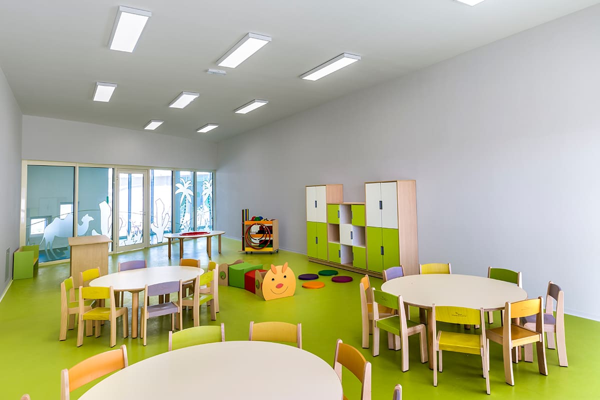 Il progetto richiama inoltre un importante messaggio ecologico, incoraggiando l’apprendimento attraverso esperienze multisensoriali all’aperto. La cura degli aspetti energetici ha reso la scuola un modello di sostenibilità, non solo perché ha conseguito l’obiettivo di Edificio ad Energia quasi Zero in classe A4 ma, soprattutto, per la forte sensibilità ambientale che ha condotto alla scelta del sistema costruttivo in setti portanti in muratura armata POROTON®, selezionato in base alle eccezionali caratteristiche multiprestazionali, e che si ritrova nell’impiego di materiali sostenibili e nell’adozione di sistemi di edilizia passiva.