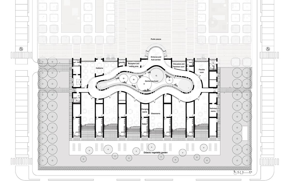 Il progetto vincitore, “Terra Madre”, è stato concepito per evocare un legame metaforico con Madre Natura, a cominciare dalla distribuzione degli ambienti: la rigida alternanza dei locali viene interrotta dalla forma fluida del corridoio anulare che racchiude una corte interna a forma di grembo materno.