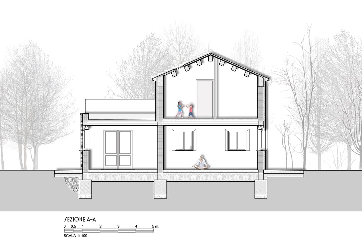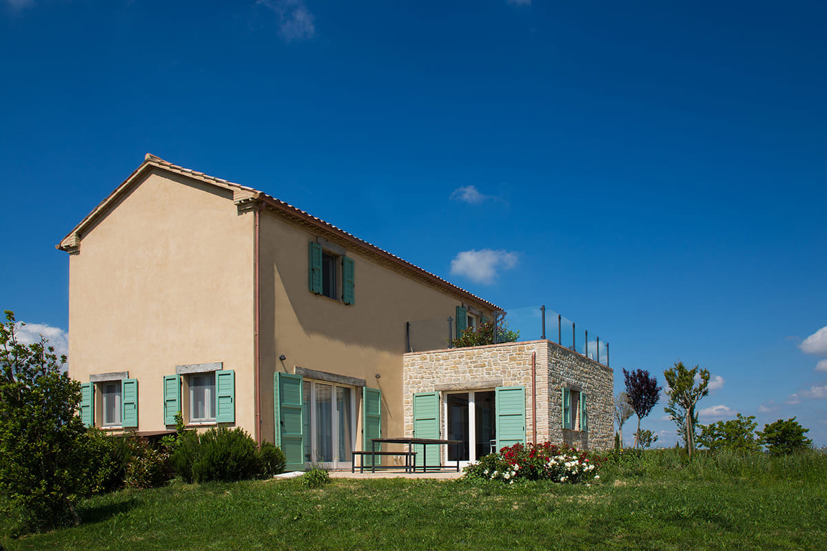 Volume, forma e tipologia costruttiva sono in piena continuità con la tradizione locale, senza snaturare il paesaggio rurale.