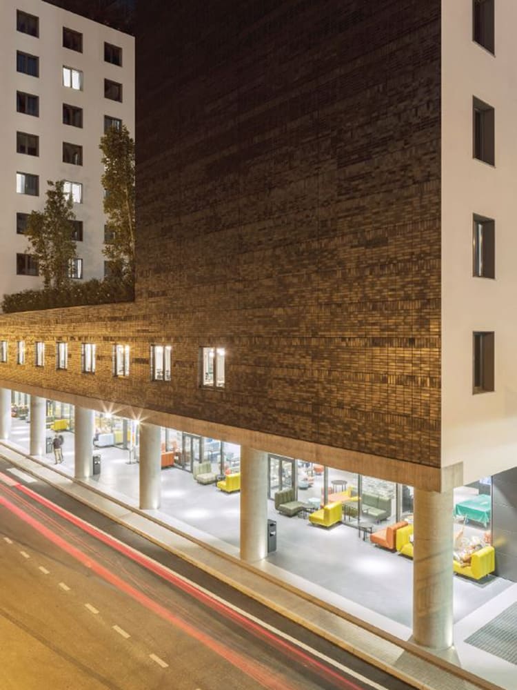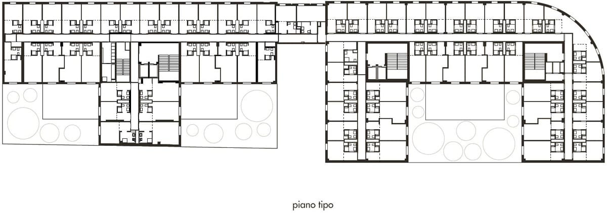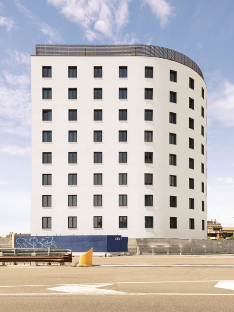 I tamponamenti perimetrali sono realizzati in blocchi POROTON® P700 per garantire semplicità esecutiva, ottime caratteristiche termoacustiche, la capacità di supportare il peso del rivestimento esterno ed una sicurezza al fuoco idonea ad una struttura pubblica di 10 piani.