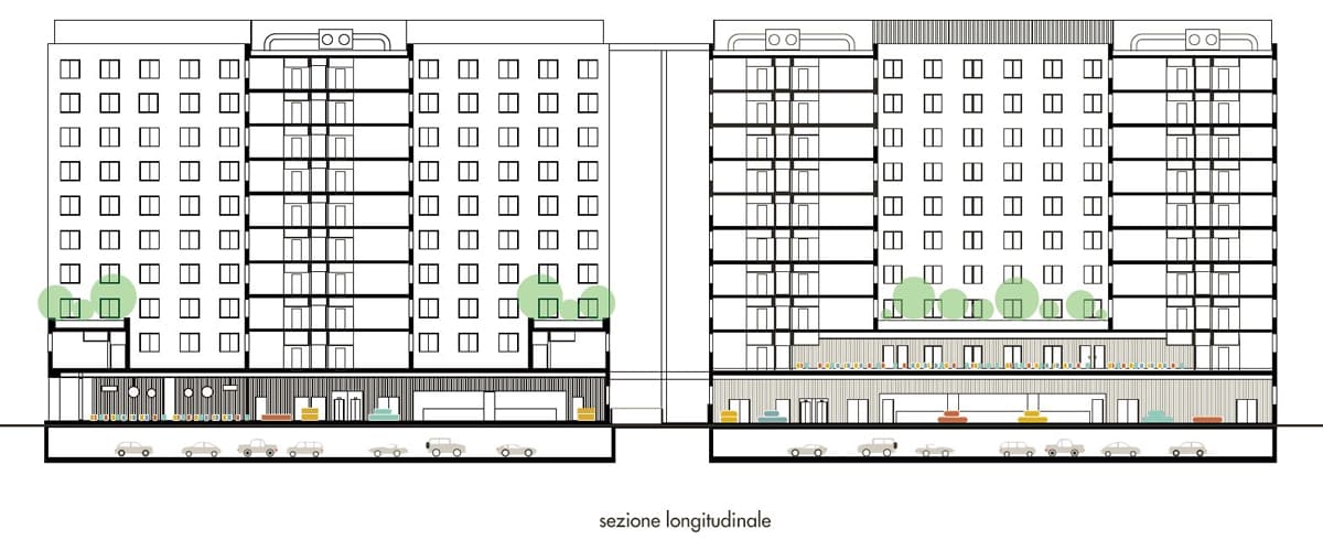 Demolizione di un fabbricato a servizio delle automobili all’ingresso di Mestre e ricostruzione di un ostello destinato a una clientela di giovani viaggiatori, che si configura come un sistema di corti aperte verso l’autostrada e la ferrovia, ribadendone il ruolo di “porta di accesso” alla città.