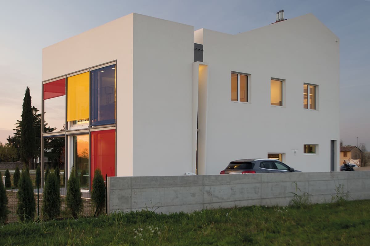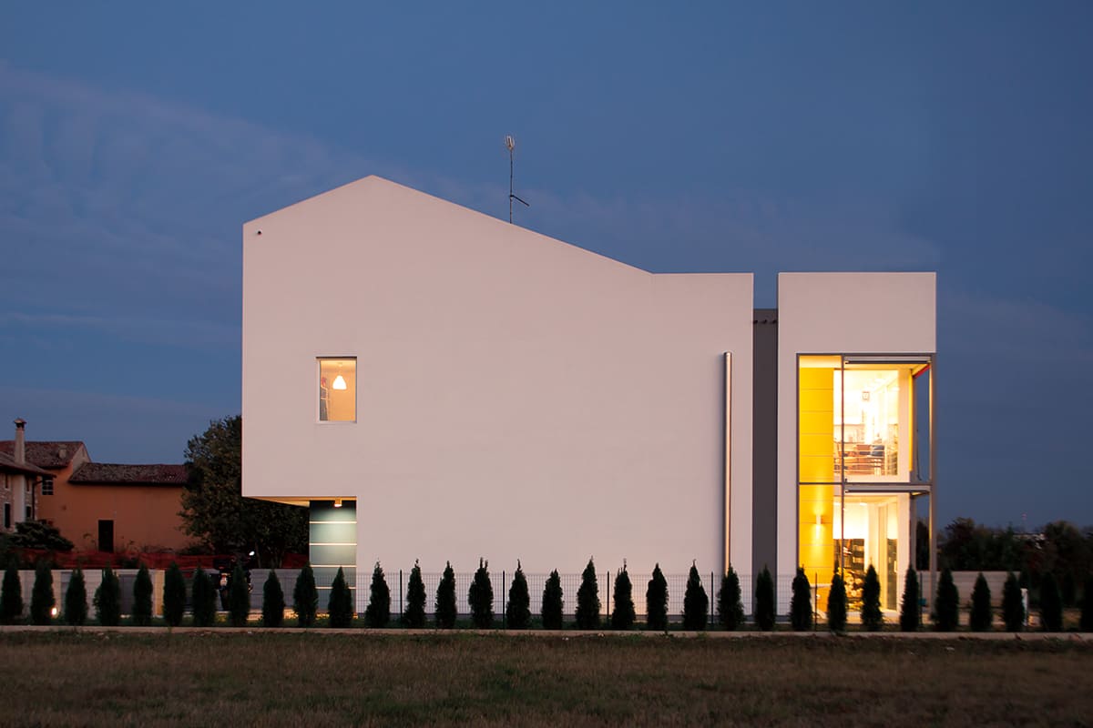 Linee pulite, superfici continue e volumi pieni, che si contrappongono all’urbanizzazione incoerente del contesto.