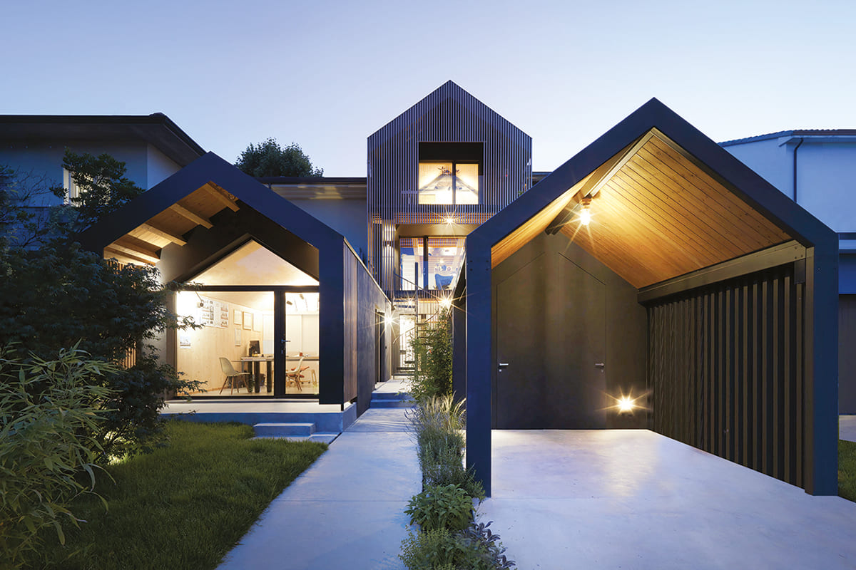 L’edificio, a Castel Gandolfo (RM), è il risultato della ristrutturazione di un complesso destinato in parte ad opificio per la lavorazione dei derivati dall’estrazione dell’olio di oliva e in parte a residenza: il fabbricato, composto da quattro corpi di fabbrica a forma di parallelepipedo, rispetta la sagoma del vecchio immobile.